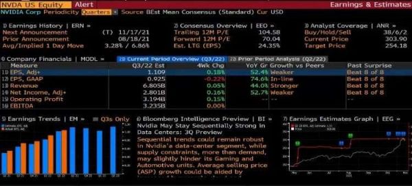 英伟达财年为每年的2月1日至第二年的1月31日,最新披露财报所属2022财年Q3财报(8月-10月),将于11月17日美股盘后发布。据彭博分析师预期,2022年Q3英伟达的营收为68.05亿美元,同比增长44.0%;调整后净利润为28.01亿美元,同比增长52.7%;调整后每股收益为1.109美元。