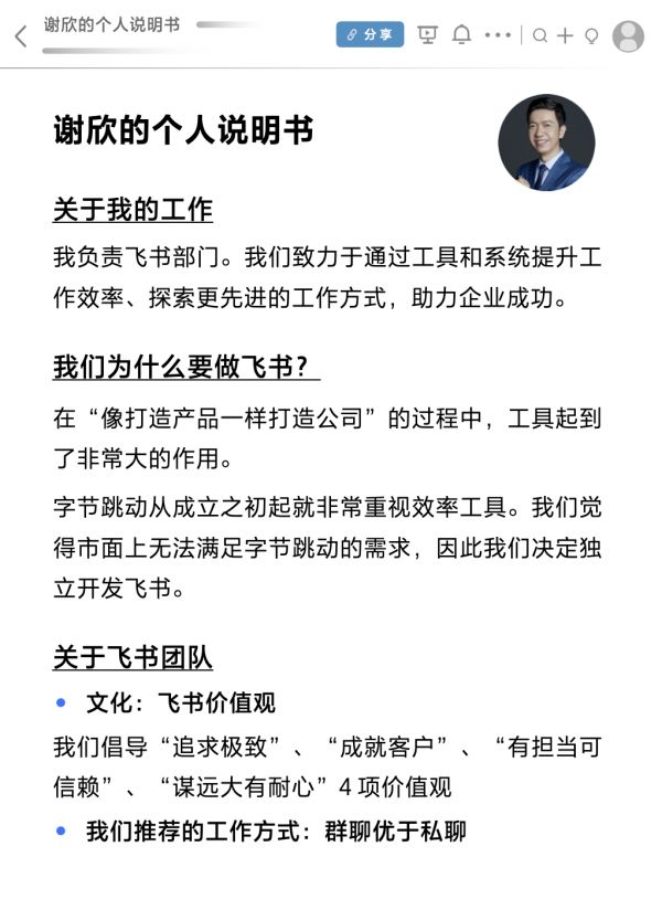 比如,这一份是我自己的个人说明书。我介绍自己的职责、飞书的愿景、如何与我沟通和配合、我能如何帮助你、以及个人兴趣等话题。这样,任何人在和我说话前,他已经知道了更加丰富生动的我,以及如何才能更好地找我解决问题,提升了沟通效率。