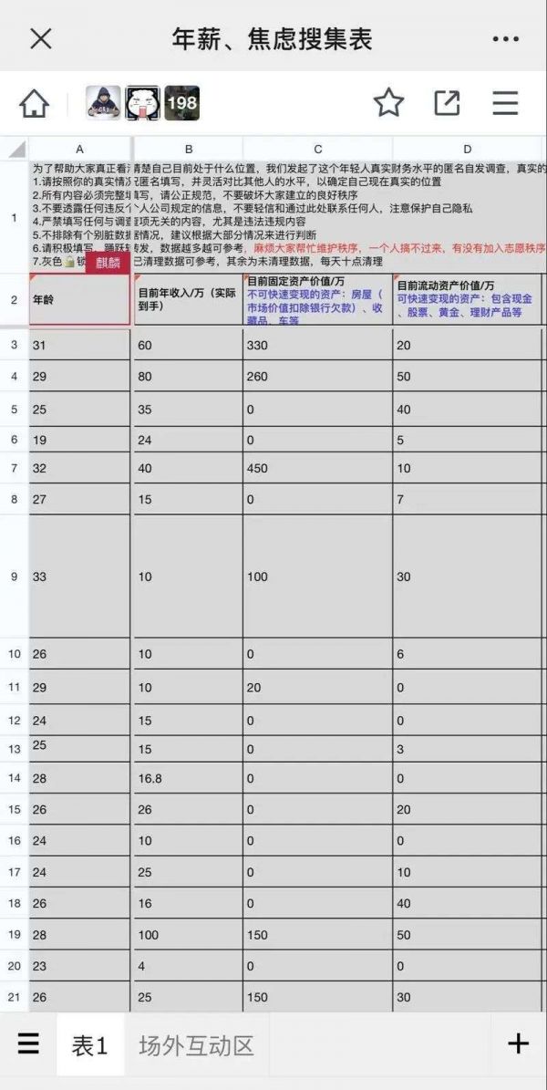 一位已经脱离“年轻人”范畴的朋友收到我转发的《年薪、焦虑搜集表》共享文档后,第一反应是“真有人填这个共享文档吗”;然后是对文档意义判定的疑惑,“不太懂这个到底想表达什么,而且真有人填这个也好奇怪”;最后上升到对个人隐私的忧虑,“大家那么喜欢窥视别人和被人窥视吗?”