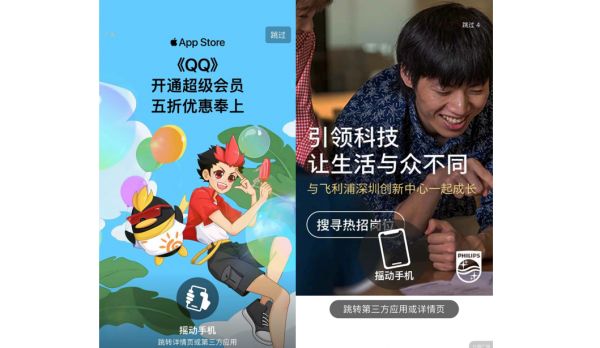 软件厂商们盯上摇一摇,主要是想在广告玩法上寻求新的出路。以往的App开屏广告为了提高用户点击量,大致可分为两种模式,其一是通过设置精美的广告内容,或是充满噱头的优惠广告吸引用户主动点击,其二是将App开屏界面完整的设为触控跳转区域,辅以更小更难找的广告关闭按钮提升用户的误触率。