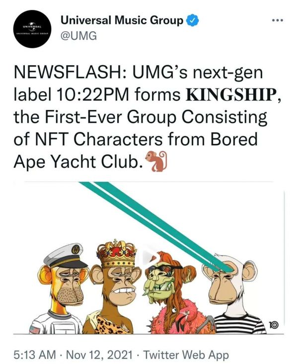 近日,环球音乐集团(UMG)与NFT投资者Jimmy McNelis的合作推出了一个名为“KINGSHIP”的虚拟偶像组合。据称,这将指导团队开发和发布新音乐、NFT项目和基于虚拟社区的产品,开启环球音乐集团的元宇宙时代。