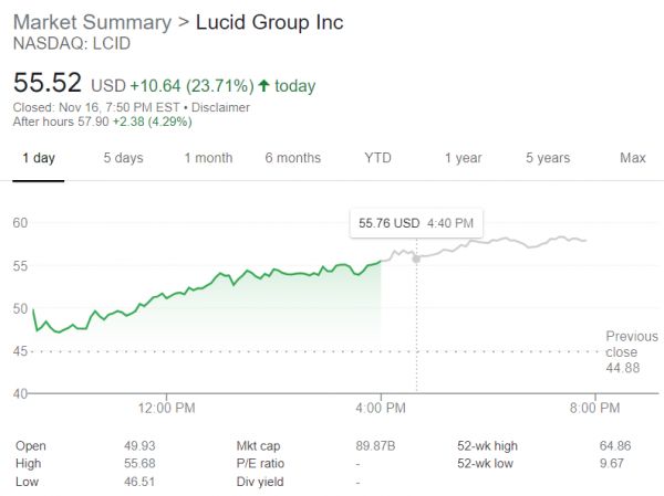 自今年7月份以来,Lucid通过SPAC上市后,股价上涨了95.86%,最大单日涨幅为31%。截止17日美股收盘,Lucid股价报52.55美元,总市值865.17亿美元,超过福特汽车(796.73亿美元),但远低于特斯拉(1.09万亿美元)。