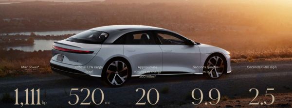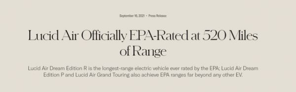 Lucid旗下首款产品Lucid Air,目前已由位于亚利桑那州卡萨格兰德的旗舰工厂生产并交付。就在今年9月, Lucid Air的Dream Edition Range版本被美国环保署( EPA)认定为迄今为止续航里程最长的电动汽车,充满电后可行驶520英里(约836公里),比Model S 长续航版还多了100多英里,引发市场关注。