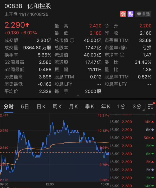 截止17日收盘,亿和控股上涨6.02%,报2.29港元,最新市值为40亿港元。