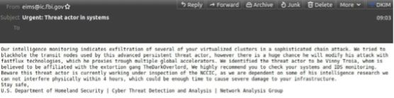 后续有关调查表明,这封邮件确实出自 FBI,并且是 FBI 自己的网址。发件人的域名 eims@ic.fbi.gov 对应的是 FBI 的刑事司法信息服务部门 (CJIS)。CJIS 负责公共安全社区相关的管理运行工作,也可辅助几个用于刑事和民事案件的国家犯罪信息系统,包括执法部门、监狱、监察部门、法院以及缓刑和审前程序。