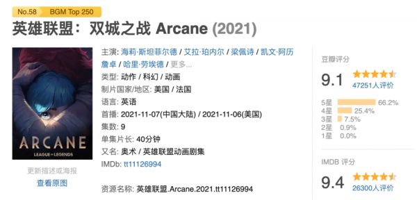 《英雄联盟》首部动画剧集《英雄联盟:双城之战》(以下简称《双城之战》)在国内播出十天后,豆瓣评分稳定至9.1分,其一星用户为0%,同时腾讯视频点击量也突破2亿次。