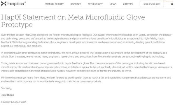 在 Meta 发布手套之后,一份 HaptX 公司 CEO 的声明也被公之于众。
