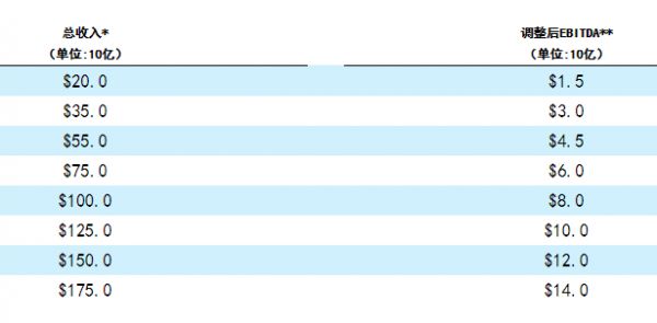市值的考核标准是以1000亿美元为起始,每涨500亿美元为一个里程,营收方面则是从200亿美元到1750亿美元之间设置了8个运营里程,经调整的利润则是从15亿美元到140亿美元之间设置了8个运营里程。