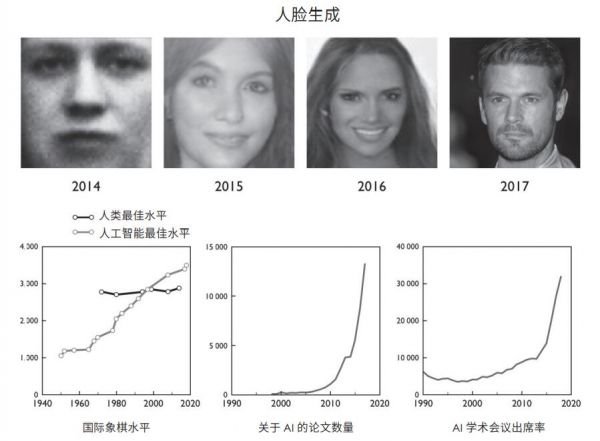 图 5.1:人工智能发展和热门程度的量表。人脸显示了最近在生成“虚拟”人物真实形象方面所取得的迅猛进展。图表则显示了国际象棋 AI 在超越人类象棋大师的过程中取得的长期进步(以 ELO 等级分衡量),以及最近该领域学术活动的增加(以 arXiv 上发布的论文数和会议的出席率衡量)
