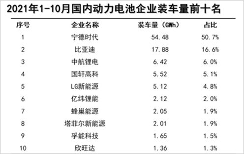再来对比一下目前的装机量水平和市占率,今年前十月,宁德时代的国内装机量占比超50%,是比亚迪的3倍以上,中航锂电的8倍以上,是国轩高科的近10倍,是亿纬锂能的25倍。