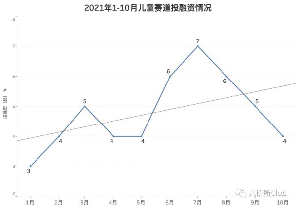 据IT桔子、烯牛数据、企名片等多方数据:自今年年初以来,每月儿童细分赛道投融资事件多为4-5起,且均不超过10起。在每月近百起的大消费赛道中,儿童细分赛道投融资事件占比较小,仍存在巨大增长空间。然而,由《2021年1-10月儿童赛道投融资情况》可知,细分领域整体呈上升趋势,更是在7月达至顶峰,融资事件达7起。