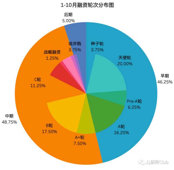 今年1-10月早期投融资占比46.25%,略低于中期48.75%的占比。其中,天使轮事件占比最高为20%,说明机构们更偏向于投资具备早期销售体系,完成初步团队搭建,并累计一定销售数据的儿童项目。