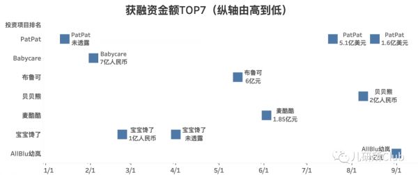 最后,我们梳理了获融资金额最多的TOP7品牌,今年获得3次融资的PatPat位居榜首,获资2次的宝宝馋了也榜上有名。
