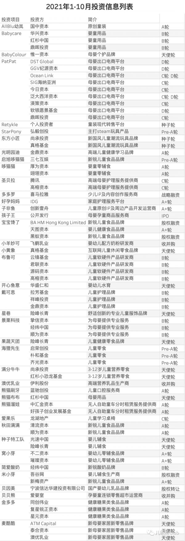 2021已不足两个月,气温骤降伴随着北方城市的第一场雪,年终味道越来明显,是时候来次对这个赛道的总结了。于是儿研所Club汇集了来自于烯牛数据、IT桔子、企名片等渠道在过去10个月内儿童细分消费领域的投融资事件,做出了以下分析:
