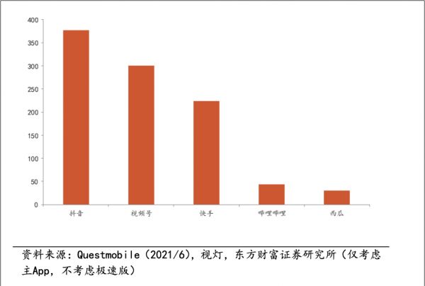 抛开用户心智不谈,据Questmobile发布的2021年6月的数据,西瓜视频的日活仍远远落后于抖音、视频号、快手、哔哩哔哩。