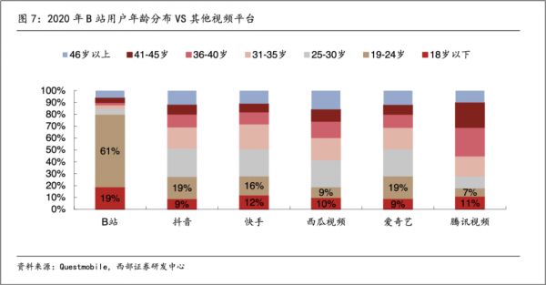 举一个小例子,从Questmobile的数据中可以看出,在B站、抖音、西瓜视频等6个视频平台中,B站的特点在于,18岁以下的用户占比最高,达19%,而西瓜视频46岁以上的用户占比最高。