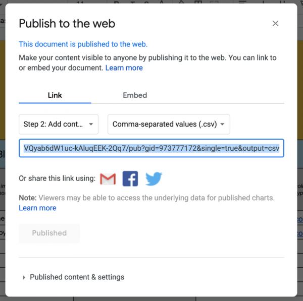 编辑完表格内容后,接下来我们需要将表格转为公开形式 :依次点击左上角菜单 File > Share > Publish to web,并在弹出的对话框里的两个下拉菜单中分别选择第二份副表 Step 2: Add content to this sheet 和 .csv 格式 Comma-separated values (*.csv),最后点击发布(Publish)按钮即可。