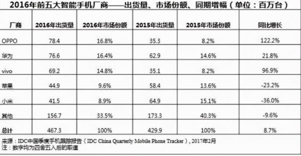 IDC数据显示,2015年曾登上国内市场智能手机出货量第一的小米,在2016年滑落至第五位,OPPO、华为、vivo则大幅上涨,超过小米分别位列前三。