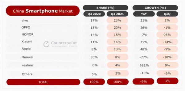 Counterpoint报告显示,2021年Q3国内智能手机市场中,vivo以23%的市场份额成为第一,排在第二的OPPO则占据20%的市场,荣耀则以15%的份额超过小米位列第三。