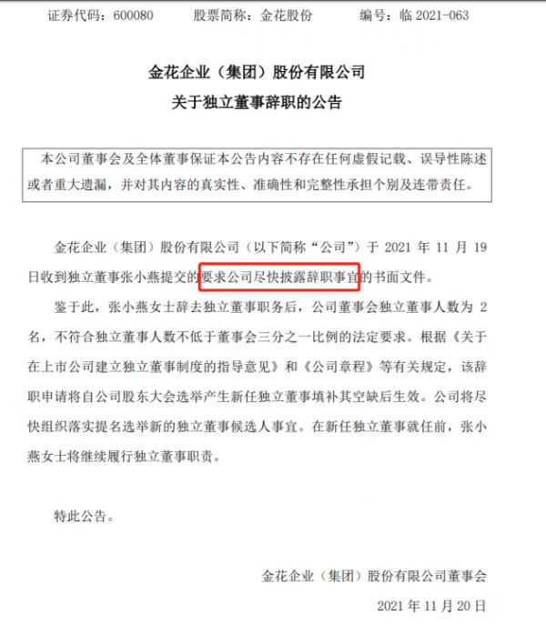 其中,不乏一些颇为“仓促”的辞职公告。如金花股份在周五晚便刊登公告,称独董“要求公司尽快披露辞职事宜”,并因此产生了独立董事人数不足的尴尬情况。
