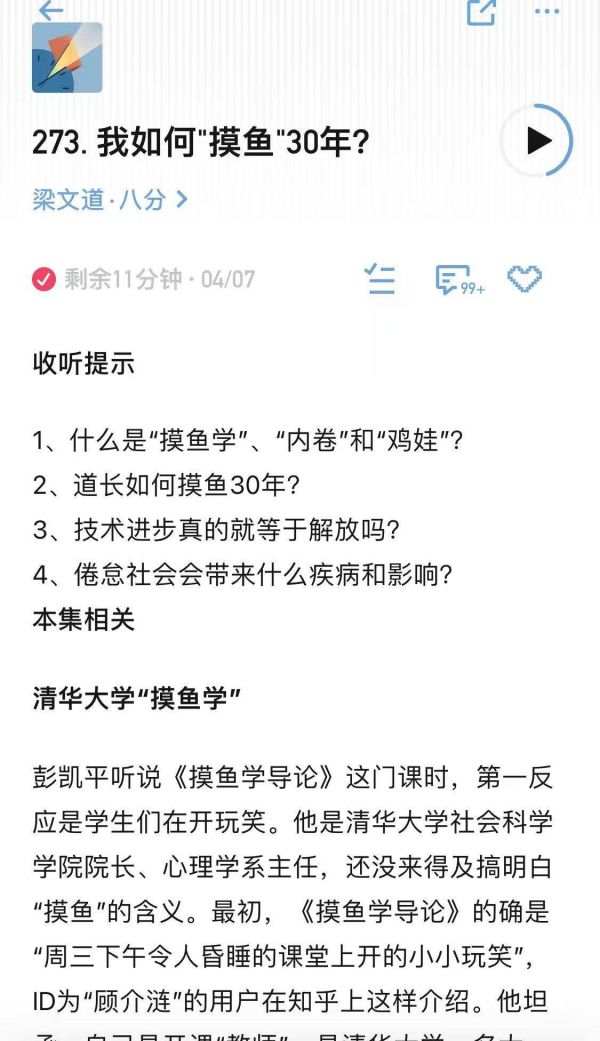 说起摸鱼,不妨重听道长梁文道发布于4月的这期播客。当时的新闻事件是清华大学开了一门名叫“摸鱼学导论”的课程,引发了互联网上一阵关于“摸鱼” 的热烈讨论。