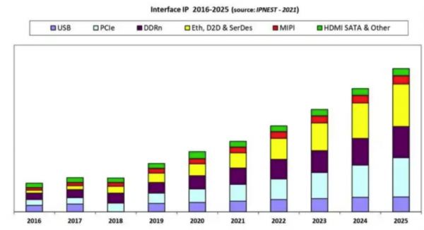 IPnest曾分析,从现在到 2025 年,接口IP将保持极高的增长率。根据IPnest提供的数据,接口IP 供应商在2020年的收入总额为10.68亿美元,而2019年这个数据为8.72亿美元,同比增长率为22.4%,并确认增长会是长期的迹象。