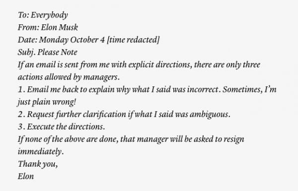 “霸道总裁”马斯克:我的指示只允许三种回应 做不到请辞职
