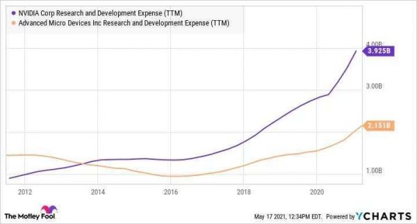 AMD则在不断挑战英伟达在消费级游戏显卡市场的统治地位,尽管从2015年的Fury X,2017年的RX Vega到2019年的Radeon VII,AMD的挑战几乎都以失败告终。在去年11月,AMD又一次发起进攻,推出了RX 6000系列显卡,尝试通过价格撼动英伟达的统治地位,但截至目前,英伟达依旧牢牢把控着83%的市场份额,而AMD则占据17%市场份额,在消费级别市场当中,由于英伟达在研发投入以及技术方面的领先优势,AMD要想追赶甚至超越难度很大。