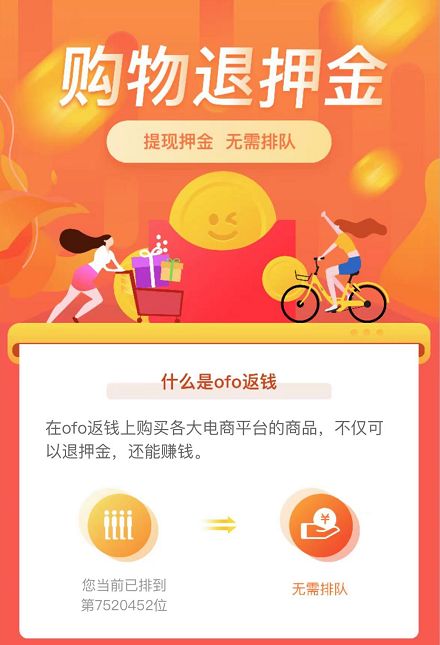 如今我们在打开ofo共享单车的APP,可以发现“购物返现金”已经成ofo客户端的主要功能。据页面介绍,只有用户同意将ofo押金兑换为返钱余额后,可使用购物返现功能,返钱余额需等用户通过ofo返钱平台跳转至第三方平台购物后才可提现。