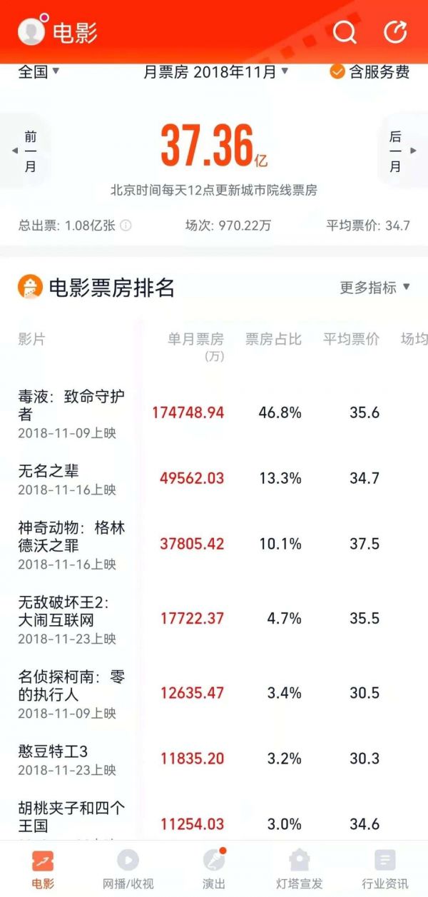 而从过去的经验里,不难发现解决这个问题的办法:超级爆款存在的同时,需要数量更多的、品质过硬的中小成本影片持续稳定地供给。像在历年11月里票房表现最好的2018年,因为有“《毒液》+《无名之辈》”的组合,和另外5部票房过亿的影片,才达到了37.36亿的高票房。