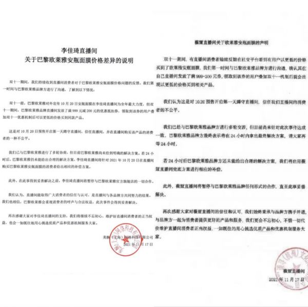11月17日晚间,李佳琦直播间、薇娅直播间几乎同步发出声明,连夜喊话欧莱雅,指责后者违背价格承诺,并宣称在欧莱雅给出解决方案之前将暂停与该品牌的合作。