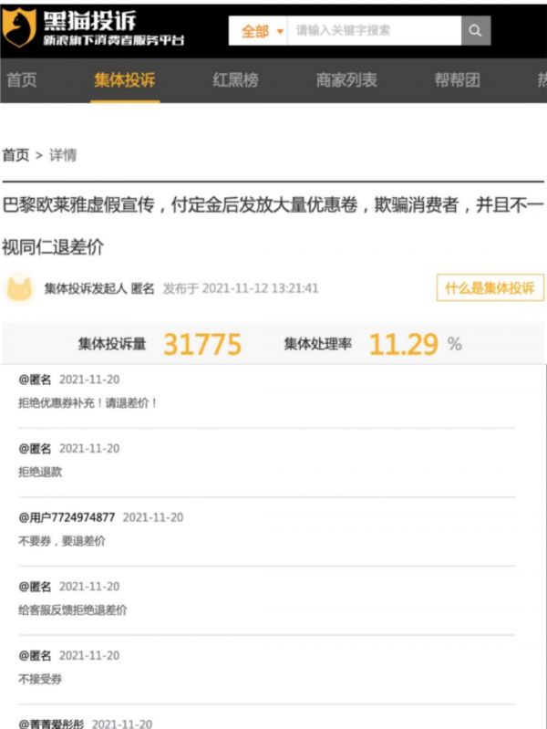 在黑猫投诉平台上,截至发稿,对于“巴黎欧莱雅虚假宣传”的集体投诉已经超过3.1万起,而处理率只有11.29%。不少用户提出的诉求都是希望欧莱雅道歉、退差价,拒绝补券。