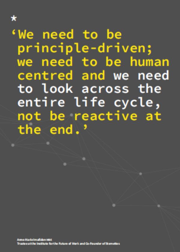 未来工作小组认为,人工智能在职场中的使用需要采取多方共治的方式,而不能完全依赖法律所保障的个人权利。在 AI 时代协调个人和集体问责机制至关重要。 例如,工会联盟(Trades Union Congress,TUC)和其他非政府机构可作为中间人,协调企业与员工在使用人工智能时的不同利益,发展相关方在人工智能生态里的合作伙伴关系。报告提出,工会联盟和非政府机构可组织专业论坛并派驻专门的人工智能技术代表从事相关工作。更重要的是,工会联盟和阿兰·图灵研究所(Turing Institute)等机构可以在政府的支持下对整个劳动力市场进行培训,以加强人们对人工智能技术的理解。