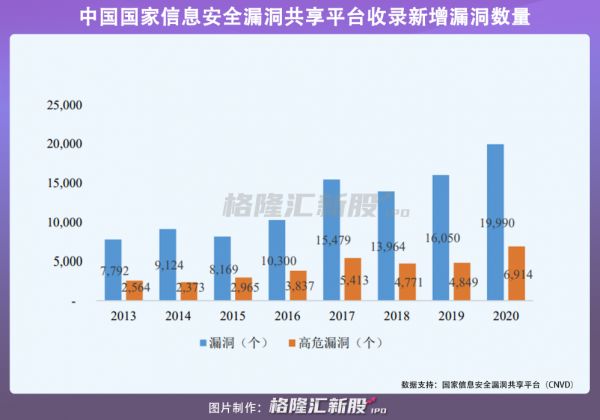 近年来,随着云计算、大数据、物联网等应用场景持续深化,人工智能、5G、量子通信等新技术突飞猛进,网络安全威胁日益突出。根据国家信息安全漏洞共享平台(CNVD)收录的数据显示,新增安全漏洞数量从 2013 年的 7792 个,增长到 2020 年约2万个,其中高危漏洞从 2013 年的 2564 个,增长到 2020 年的 6914 个。