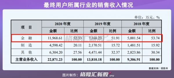 按客户收入划分,联软科技最终用户群体主要来自金融、制造等领域。报告期内,来自金融领域的客户群体贡献的收入占到了其主营业务收入的50%以上,公司对金融客户形成一定依赖。未来如果联软科技的金融领域客户群体采购计划规模下降,其主营收入或将出现下滑。