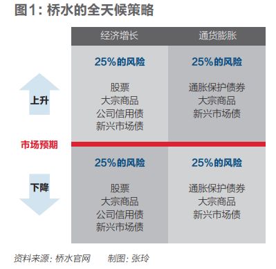 达利欧设想了四种不同的宏观经济环境(增长率上升加通胀上升、增长率上升加通胀率下降、增长率下降加通胀上升、增长率下降加通胀率下降)及四种不同的投资策略,并将其结合起来构建资产组合,以控制波动和损失。这种从0到1的创新性理念现在被业界称为“风险平价”(risk parity),是达利欧试图为自己的家族设计一种风险中性的家族信托时发现的。