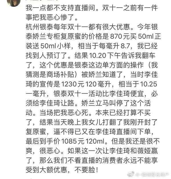 去年10月份,某品牌曾联系分销商拿货,但在和头部主播签约之后,不仅欠下约定好的货,还给了大主播更大的优惠力度,不少分销渠道都因此蒙受损失。线下门店也没能逃过主播控价,有消费者称准备参加银泰商城娇兰专柜的活动,商场补贴后,比李佳琦直播间的价格要更便宜。娇兰品牌方知道后,立刻叫停了活动,给李佳琦让路。