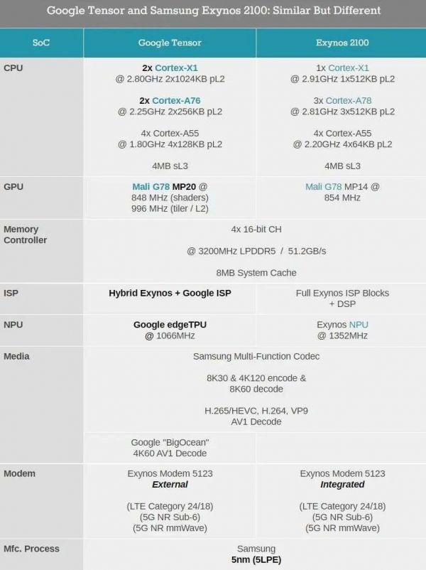 同宗不同源的 Exynos 2100 与 Google Tensor. 图片来自:anandtech