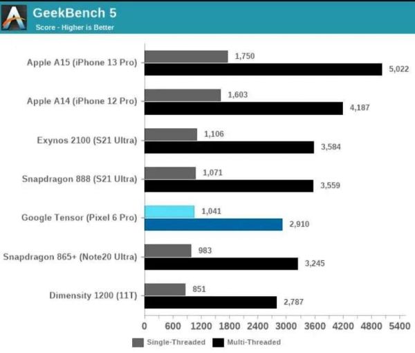 Google Tensor GeekBench 5 跑分。图片来自:anandtech
