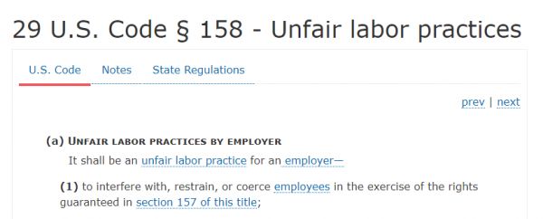 实际上,这样的诉求也和法律保持了一致。美国有一项《国家劳资关系法》(National Labor Relations Act),用于保护员工与公司进行集体协商的权利。而公开讨论工资,也是员工集体协商行为的一种。根据该法案的第八条(9 U.S. Code § 158),公司限制员工之间讨论薪资、工时的行为,属于不平等劳工待遇的定义。