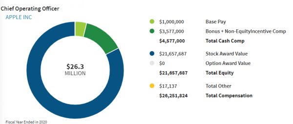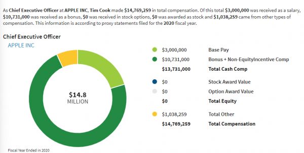 至于苹果CEO 蒂姆·库克,其2020年薪酬包为1477万美元,其中300万美元工资、1073万美元奖金,103万美元其它奖励: