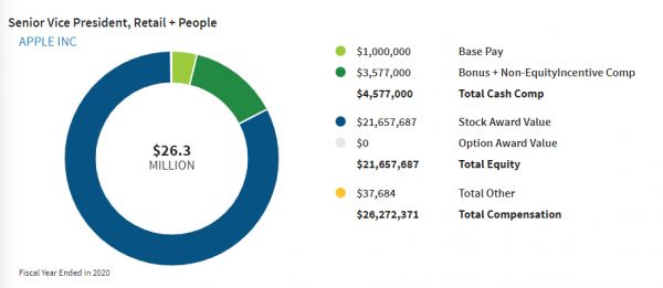 COO Jeff Williams 和零售业务兼人力 SVP Deirdre O'Brien2020年总收入分别为2625万和2627万美元,构成均为100万美元工资、357万美元奖金,2165万美元股票: