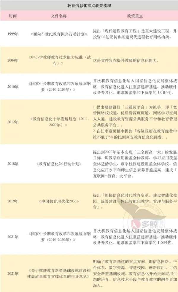 回溯过往,国内教育信息化的发展与政策规划的制定本就密不可分,先后经历了从校园基础设施和网络建设,到完善平台和信息资源,再到信息技术与教育教学深度融合的过程。