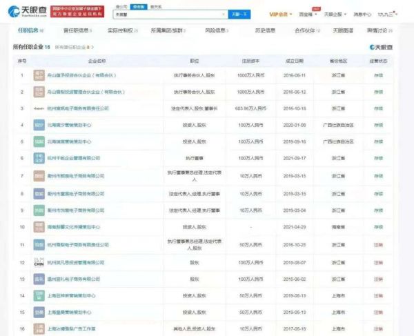 其中,杭州雪梨电子商务有限责任公司、上海豆梓麻营销策划中心、上海皇桑营销策划中心、上海冰糖雪梨广告工作室4家均是注销状态。此外,雪梨还是12家公司的股东、7家公司的高管。