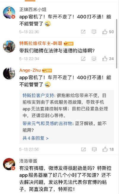 去年5月,特斯拉App宕机后微博网友的反应图源:网络