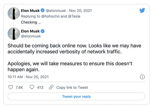 推特网红马斯克在被用户大吐苦水的推文圈出之后,亲自上场当了一回客服,表示“正在检查”。随即又跟进,说“现在应该已经恢复了。看起来我们可能是因为配置错误导致网络流量过载。非常抱歉,我们将采取措施确保此类事件不再发生。”