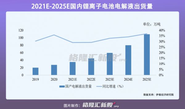 聚焦锂离子电池材料市场来看,近年来,受下游新能源汽车行业迅速发展,带动动力电池需求上升;可穿戴设备、无人机等新兴产品兴起为消费电子带来更广阔的应用场景;以及电动汽车光储式充电站等储能电池市场的逐渐打开,锂离子电池电解液市场出货量增速较快,且有望持续。预计国内锂离子电池电解液出货量将从2019年近20万吨增长至2025年约100万吨。