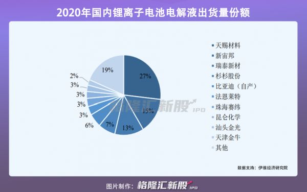 按2020年出货量计,瑞泰新材的锂离子电池电解液产品居国内行业第三,市场份额约为13%。锂离子电池电解液下游为锂离子电池,下游应用领域包括动力电池、 消费电池以及储能电池等多种方向,公司下游客户包括宁德时代、LG化学、亿纬锂能等行业巨头。