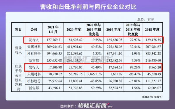 受益于市场红利,驱动主要产品销售收入增长,瑞泰新能业绩取得稳健增长。2018年至2021年上半年,实现营收分别为12.95亿元、16.57亿元、18.15亿元、17.78亿元;同期录得净利润分别为1.22亿元、2.30亿元、2.98亿元、1.94亿元。但是与同行业可比公司相比,瑞泰新材营收和净利润规模处于低位,公司资金实力相对较弱。