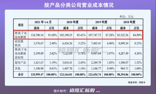 锂离子电池电解液是瑞泰新材主要收入来源,报告期内,其成本占公司营业成本比重较大,超过80%,且2021年上半年进一步增加至91.69%,公司也面临生产成本持续上涨导致利润空间缩窄的隐忧。